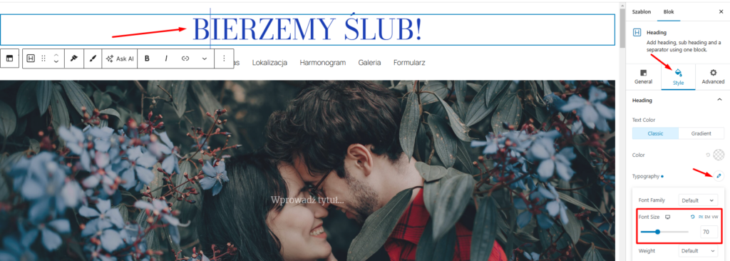 Aby edytować tekst nagłówka, należy kliknąć na nagłówek i wprowadzić zmiany w tekście. Możliwa jest również zmiana rozmiaru tekstu poprzez widoczne ustawienia po prawej stronie edytora. Należy przejść do sekcji Style i nacisnąć ikonę ołówka obok Typography. W tym miejscu można zmniejszyć i zwiększyć tekst wpisując odpowiednią wartość.