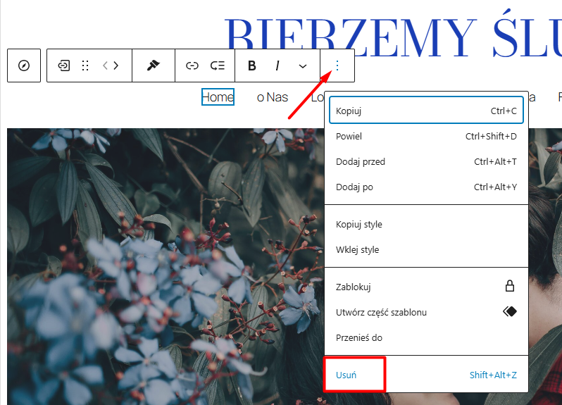 Aby usunąć element z menu należy kliknąć na konkretny element z menu, kliknąć trzy kropki w ustawieniach nad blokiem a następnie kliknąć opcję usuń znajdującą się na samym dole.