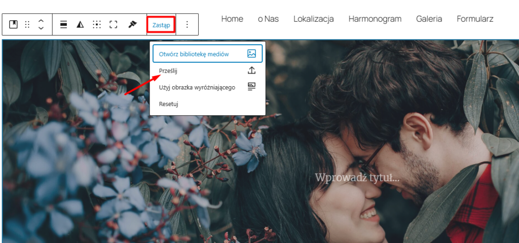 Aby zmienić zdjęcie baneru należy kliknąć na zdjęcie. Nad zdjęciem pojawią się ustawienia i należy kliknąć Zastąp i wybrać prześlij. Pozwoli to na przesłanie nowego zdjęcia na stronę. Aby powrócić do pierwotnego zdjęcia należy ponownie kliknąć Zastąp a następnie wybrać Otwórz bibliotekę mediów i znaleźć zdjęcie które było w zaimplementowane pierwotnie.