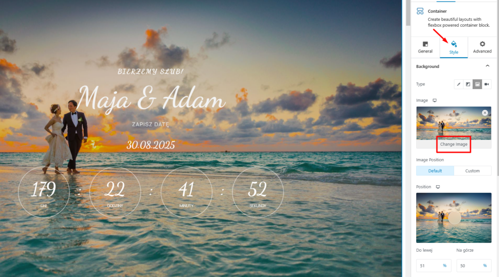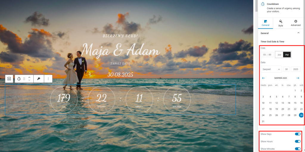 Jeżeli chcemy zmienić końcową datę dla odliczania należy kliknąć na blok z odliczaniem a jego ustawienia wyświetlą się po prawej stronie edytora, w których znajdziemy miejsce4 na zmianę daty i godziny wydarzenia. Możliwe również jest wyłączenie odliczania dla sekund, minut itd.