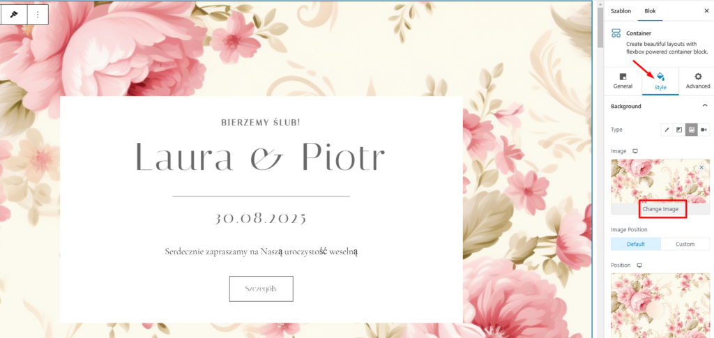 Aby zmienić zdjęcia baneru należy kliknąć zdjęcie (najlepiej w rogach zdjęcia) po vzym otworzą się ustawienia bloku po prawej stronie. Wejdź w zakładkę Style a następnie kliknij change image. Pozwoli to na przesłanie nowego zdjęcia na stronę. Aby powrócić do pierwotnego zdjęcia należy ponownie kliknąć change image i znaleźć zdjęcie które było w zaimplementowane pierwotnie.