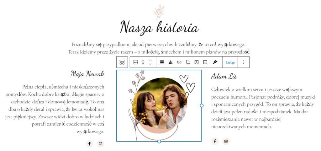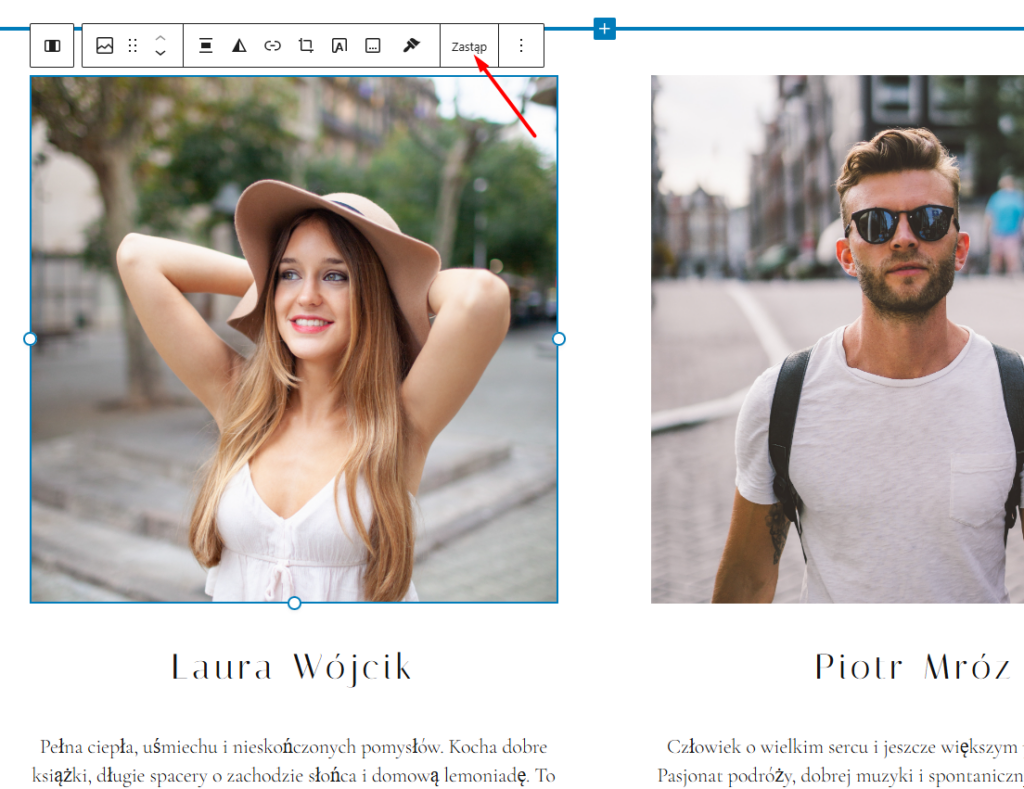 Aby zmienić zdjęcie należy kliknąć na zdjęcie. Nad zdjęciem pojawią się ustawienia i należy kliknąć Zastąp i wybrać prześlij. Pozwoli to na przesłanie nowego zdjęcia na stronę. Zmienione zdjęcie na stronie dla odwiedzających automatycznie przyjmie kształt koła. Aby powrócić do pierwotnego zdjęcia należy ponownie kliknąć Zastąp a następnie wybrać Otwórz bibliotekę mediów i znaleźć zdjęcie które było w zaimplementowane pierwotnie.