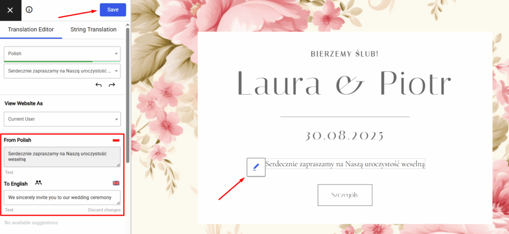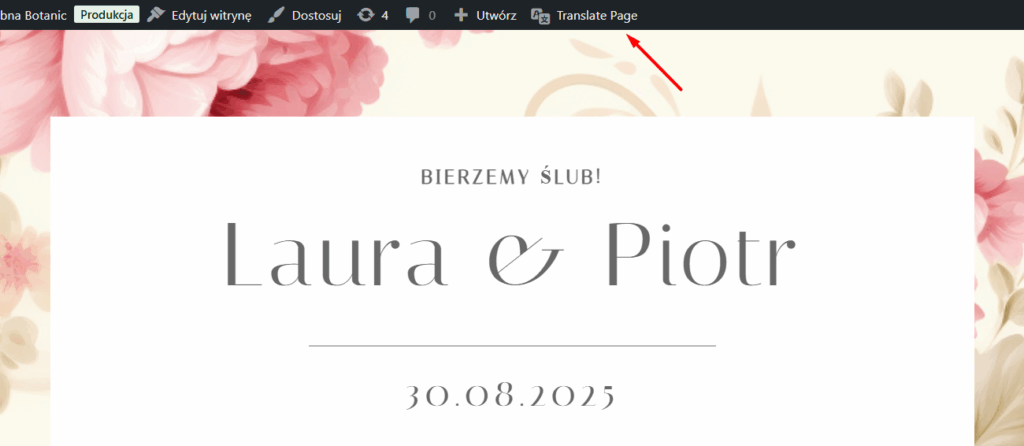 Jeżeli witryna ma wersję językową, administrator może wprowadzić zmiany w tłumaczeniach poprzez przycisk Translate Page u góry strony (będąc zalogowanym).